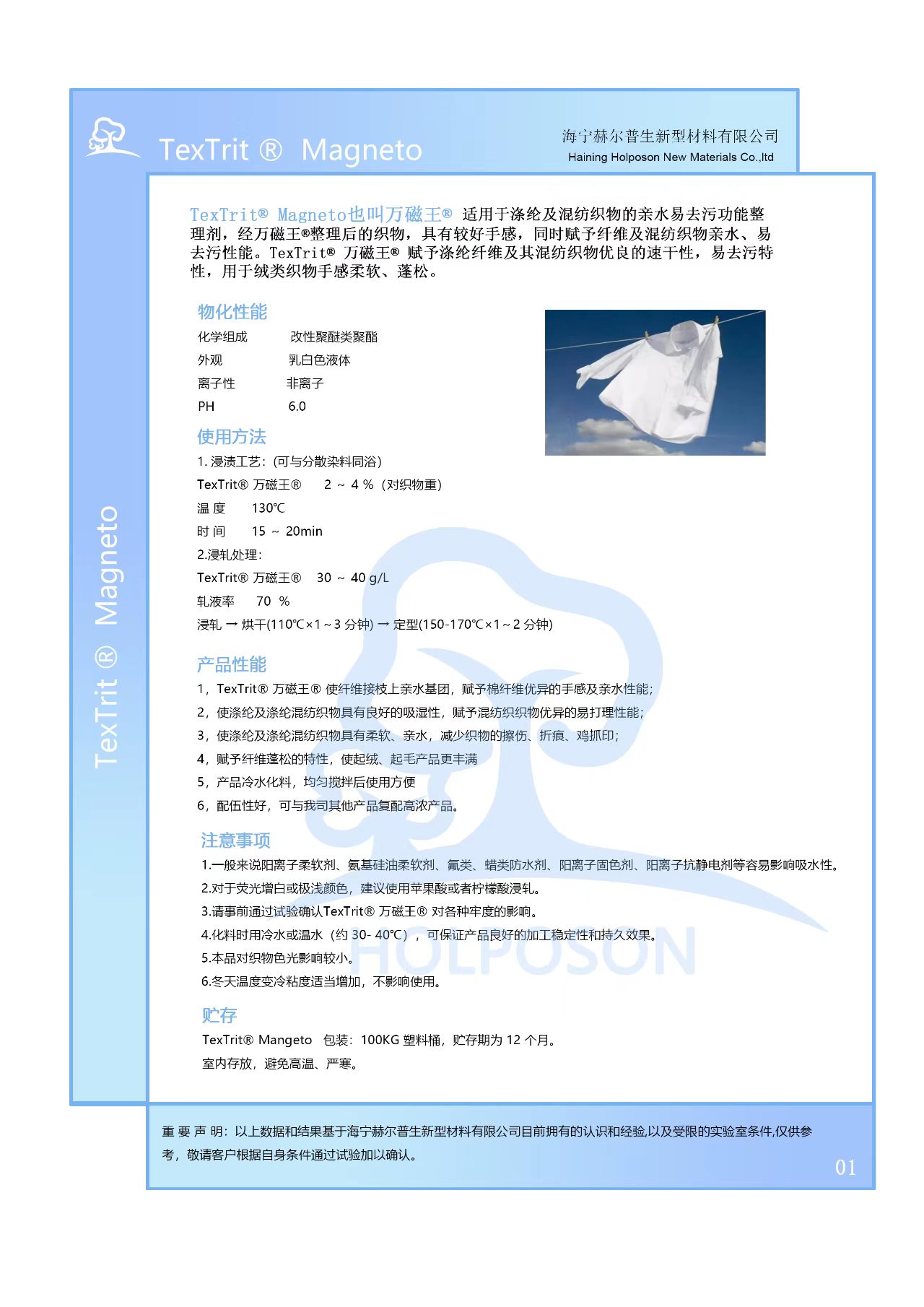 HOLPOSON® Magneto也叫万磁王®, 是适用于涤纶及混纺织物的亲水易去污功能整理剂,经万磁王®整理后的织物,具有较好手感,同时赋予纤维及混纺织物亲水、易去污性能。HOLPOSON® 万磁王® 赋予涤纶纤维及其混纺织物优良的速干性,易去污特性,用于绒类织物手感柔软、蓬松。