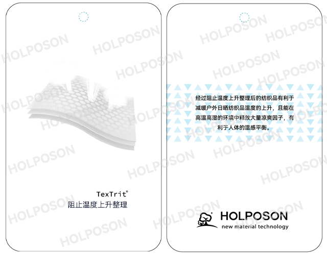 夏日炎炎,日光强烈,阳光是有能量的光线,其中包括远红外、可见光、紫外线等。深色黑色面料会吸收可见光并转化为热量,使深黑色面料升温速度高于白色浅色面料。HOLPOSON® COOL-COMBO是专为服装面料开发的阻止温度上升系列助剂,是由三种组分的助剂组成的温度上升整理剂,当纺织品面料曝光在阳光下时能屏蔽紫外线,并释放阻止温度上升因子,可以有效的降低面料表面的温度。
