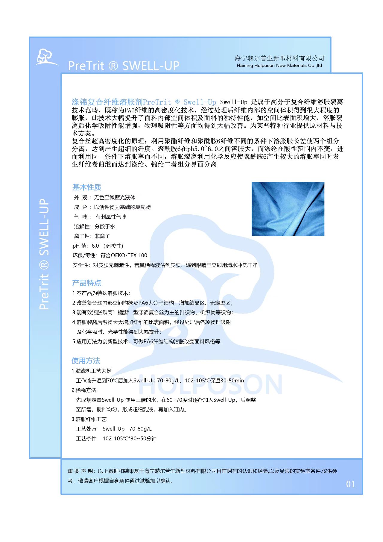 Swell-Up 是属于高分子复合纤维溶胀裂离技术范畴,既称为PA6纤维的高密度化技术,经过处理后纤维内部的空间体积得到很大程度的膨胀,此技术大幅提升了面料内部空间体积及面料的独特性能,如空间比表面积增大,溶胀裂离后化学吸附性能增强,物理吸附性等方面均得到大幅改善。为某些特种行业提供原材料与技术方案。