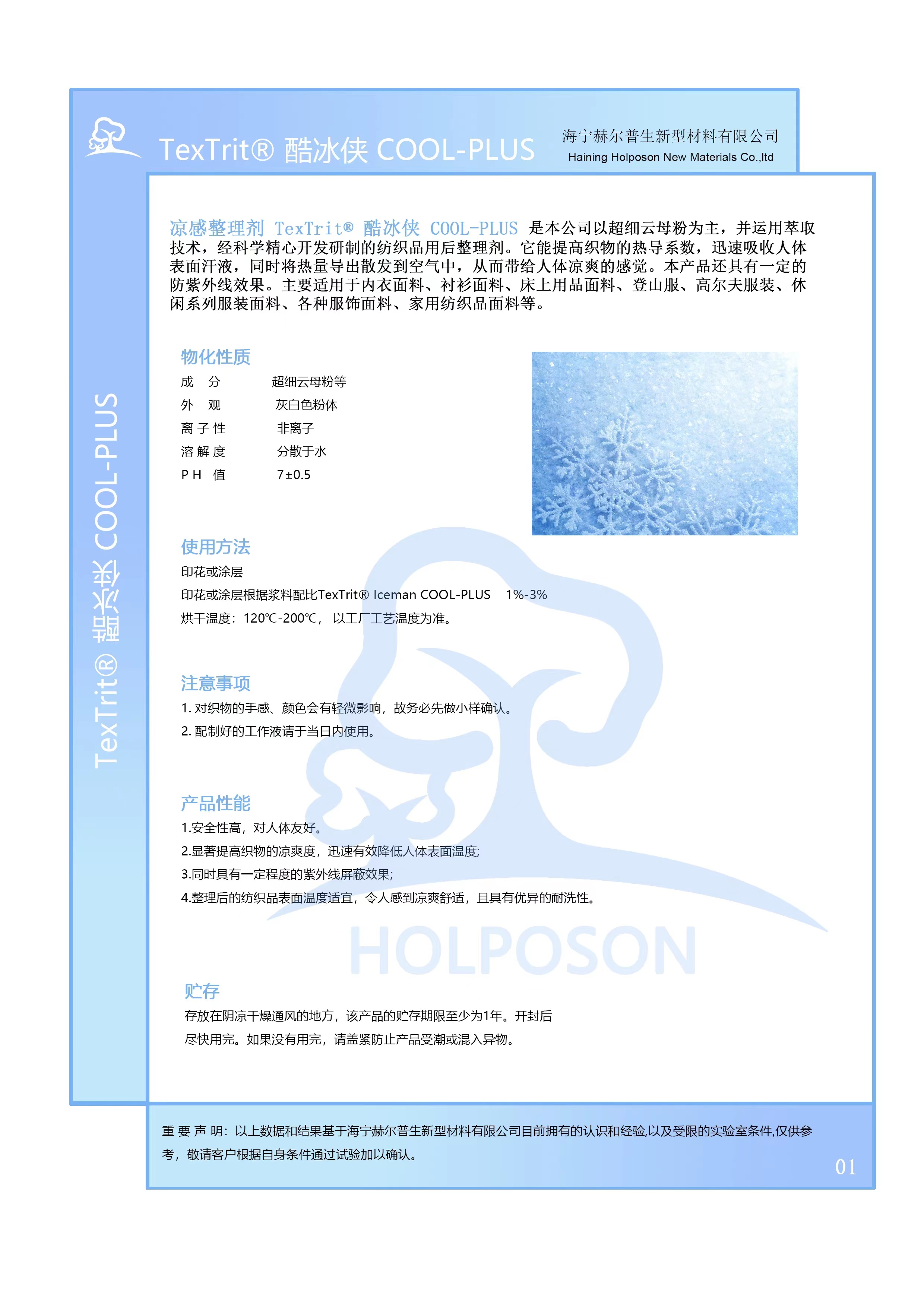 HOLPOSON® Iceman COOL-PLUS 是本公司以超细云母粉为主,并运用萃取技术,经科学精心开发研制的纺织品用后整理剂。它能提高织物的热导系数,迅速吸收人体表面汗液,同时将热量导出散发到空气中,从而带给人体凉爽的感觉。本产品还具有一定的防紫外线效果。主要适用于内衣面料、衬衫面料、床上用品面料、登山服、高尔夫服装、休闲系列服装面料、各种服饰面料、家用纺织品面料等。
