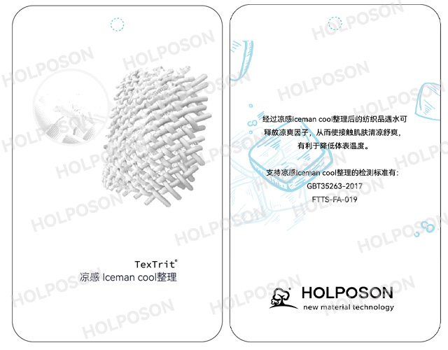 HOLPOSON®ICEMAN COOL也叫酷冰侠®是一款专门针对纺织品开发的凉感功能整理剂,是由我公司的东华大学博士团队开发的以木糖醇,赤糖醇,丝蛋白为主的接触吸湿凉感整理剂。适合用于天丝,冰丝,棉,涤纶等各种纤维的后整理。其作用原理:凉感整理剂HOLPOSON® ICEMAN COOL处理在面料表面的木糖醇遇水发生吸热反应,释放凉爽因子从而使接触到凉爽因子的皮肤清凉舒爽,另外其所含有的丝蛋白成分具有良好的保湿功能,清凉保湿双组合使得人们在炎炎的夏日有降温防护的可能。