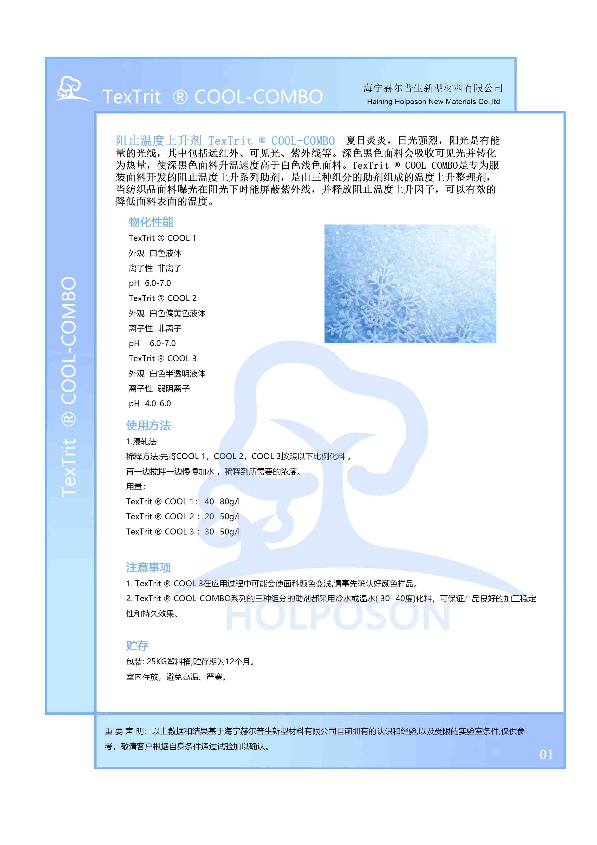 2. HOLPOSON® COOL-COMBO系列的三种组分的助剂都采用冷水或温水( 30- 40度)化料,可保证产品良好的加工稳定性和持久效果。