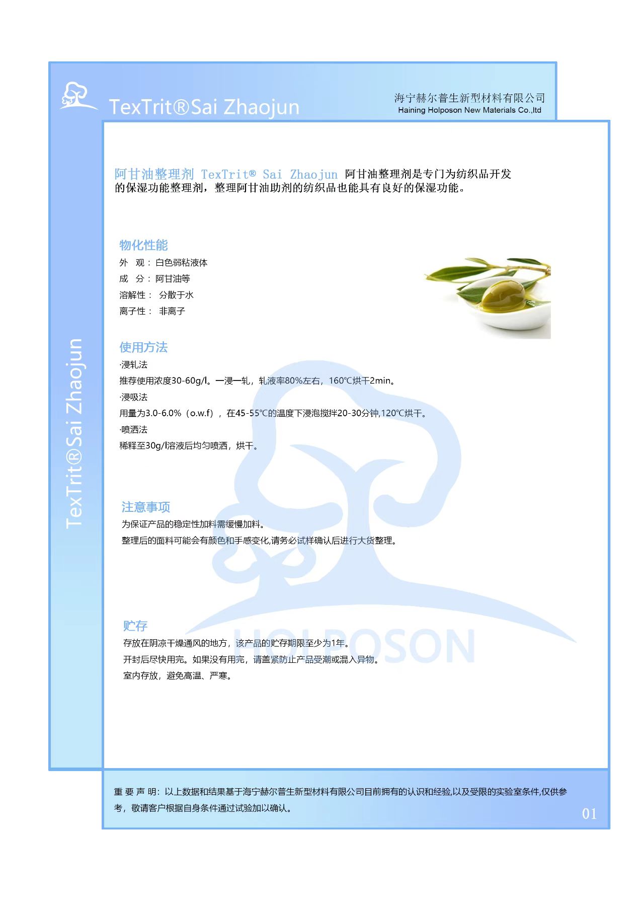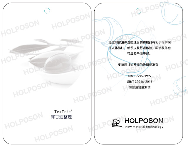 阿甘油整理剂是专门为纺织品开发的保湿功能整理剂,整理阿甘油助剂的纺织品也能具有良好的保湿功能。
