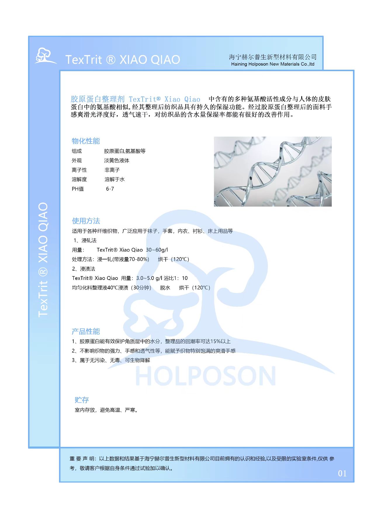 胶原蛋白整理剂HOLPOSON® Xiao Qiao中含有的多种氨基酸活性成分与人体的皮肤蛋白中的氨基酸相似,经其整理后纺织品具有持久的保湿功能。经过胶原蛋白整理后的面料手感爽滑光泽度好,透气速干,对纺织品的含水量保湿率都能有很好的改善作用。