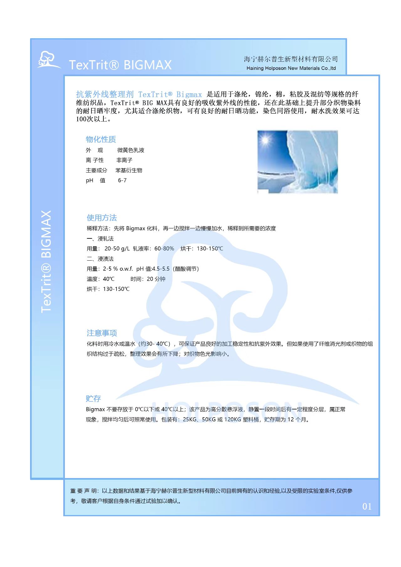 HOLPOSON® BIG MAX是适用于涤纶,锦纶,棉,粘胶及混纺等规格的纤维纺织品,HOLPOSON® BIG MAX具有良好的吸收紫外线的性能,还在此基础上提升部分织物染料的耐日晒牢度,尤其适合涤纶织物,可有良好的耐日晒功能,染色同浴使用,耐水洗效果可达100次以上。