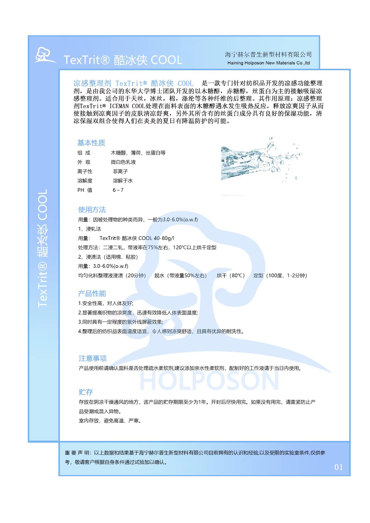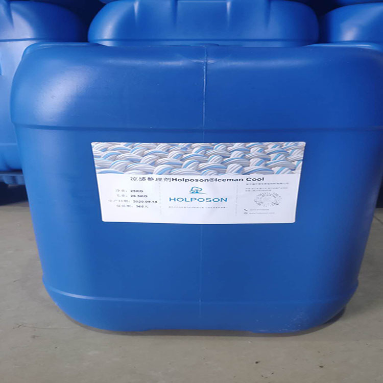 HOLPOSON®ICEMAN COOL也叫酷冰侠®是一款专门针对纺织品开发的凉感功能整理剂,是由我公司的东华大学博士团队开发的以木糖醇,赤糖醇,丝蛋白为主的接触吸湿凉感整理剂。适合用于天丝,冰丝,棉,涤纶等各种纤维的后整理。其作用原理:凉感整理剂HOLPOSON® ICEMAN COOL处理在面料表面的木糖醇遇水发生吸热反应,释放凉爽因子从而使接触到凉爽因子的皮肤清凉舒爽,另外其所含有的丝蛋白成分具有良好的保湿功能,清凉保湿双组合使得人们在炎炎的夏日有降温防护的可能。