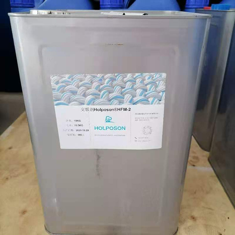交联剂HOLPOSON® HFM-2是具有多分支多官能末端封闭型异氰酸脂基团,结合拼用织物功能整理剂经过加热处理提高交联性能效果。尤其是与织物防水剂和抗菌整理剂等其它弱阳离子及非离子乳液相溶性良好。加热处理时不会发生甲醛。