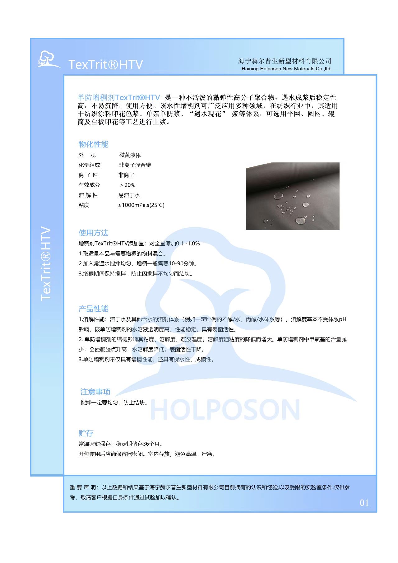 单防增稠剂HOLPOSON®HTV是一种不活泼的黏弹性高分子聚合物,遇水成浆后稳定性高,不易沉降,使用方便。该水性增稠剂可广泛应用多种领域,在纺织行业中,其适用于纺织涂料印花色浆、单亲单防浆、“遇水现花” 浆等体系,可选用平网、圆网、辊筒及台板印花等工艺进行上浆。