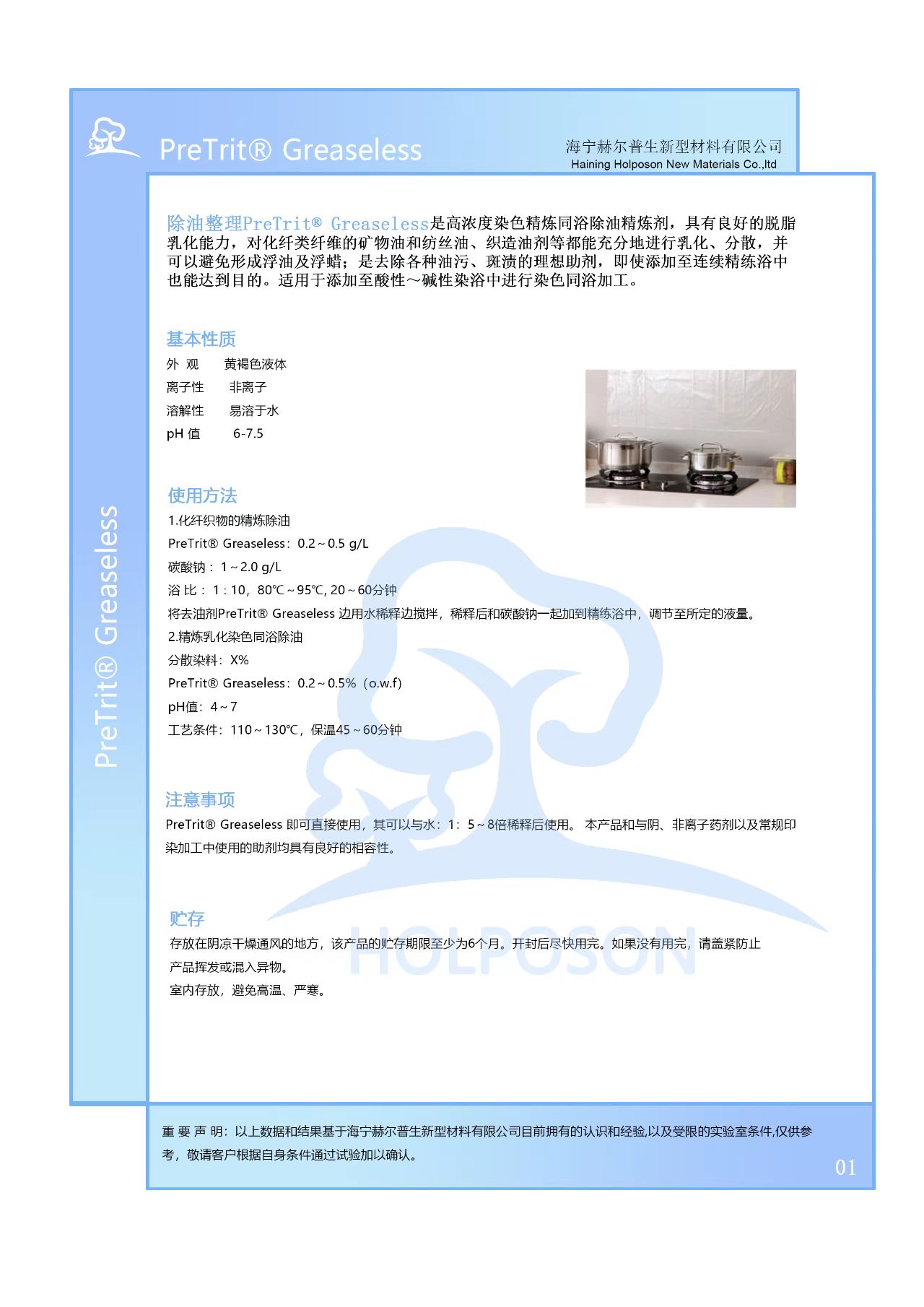 HOLPOSON® Greaseless 即可直接使用,其可以与水:1:5~8倍稀释后使用。 本产品和与阴、非离子药剂以及常规印染加工中使用的助剂均具有良好的相容性。