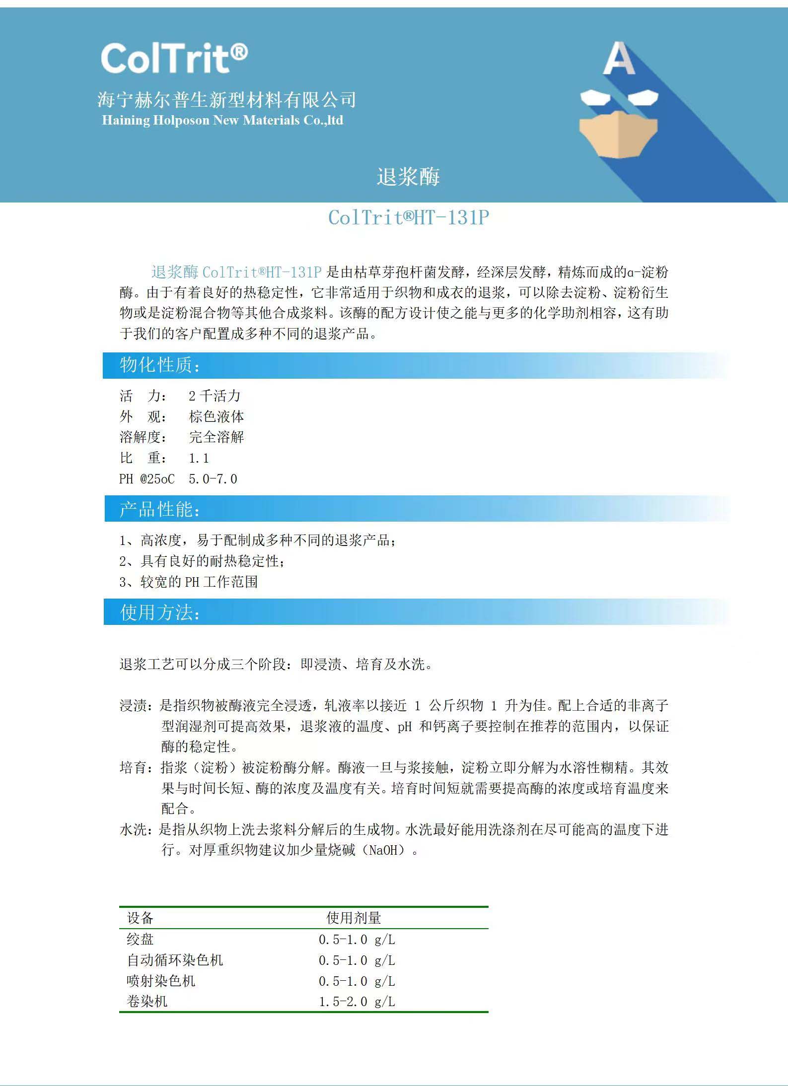 退浆酶ColTrit®HT-131P是由枯草芽孢杆菌发酵,经深层发酵,精炼而成的ɑ-淀粉酶。由于有着良好的热稳定性,它非常适用于织物和成衣的退浆,以除去淀粉、淀粉衍生物或是淀粉混合物等其他合成浆料。该酶的配方设计使之能与更多的化学助剂相容,这有助于我们的客户配置成多种不同的退浆产品。