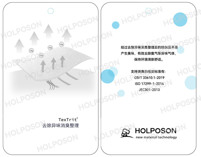 HOLPOSON® Hulk 是我司东华大学博士团队开发的纺织品消臭整理剂,能够有效吸附氨、硫化氢、三甲胺、甲基硫醇以及苯酚,氧化氮、醛类等有刺激气味的臭气,具有良好的净化异味气体功能,为适用人群营造舒适清新安全的生活环境。消臭整理剂HOLPOSON® Hulk可以在涤纶,棉,粘胶及混纺织物后整理工艺添加,适用于:家纺、服装、地毯、窗帘、袜子、车内饰等领域。