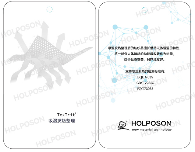 HOLPOSON® HOT 适合用于棉,粘胶,涤纶,晴纶等各种纤维的后整理。其作用原理 HOLPOSON® HOT 是处理在面料上,使面料周围的水蒸气或者汗蒸汽凝聚成水珠或者汗珠所产出的凝聚热,让人体感受到暖感,从而达到蓄热保暖的功能。