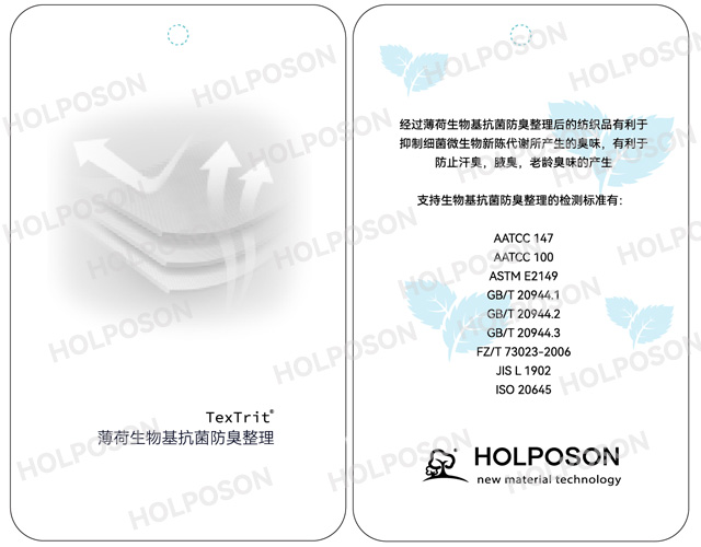 薄荷抗菌防臭整理剂HOLPOSON®A-X是一种由薄荷中提取的薄荷醇复合有机高分子抗菌整理剂,能有效抑制金黄色葡萄球菌、大肠杆菌、白色念珠菌等革兰氏阳性和革兰氏阴性细菌的生长。薄荷安全清新能有效中和异味分子,让纺织品具有清新感,减少因异味带来的不舒适感。适用于如棉、黏胶、涤纶、尼龙等混纺织物。主要应用在服装、家纺、医用防护无纺布等纺织品.
