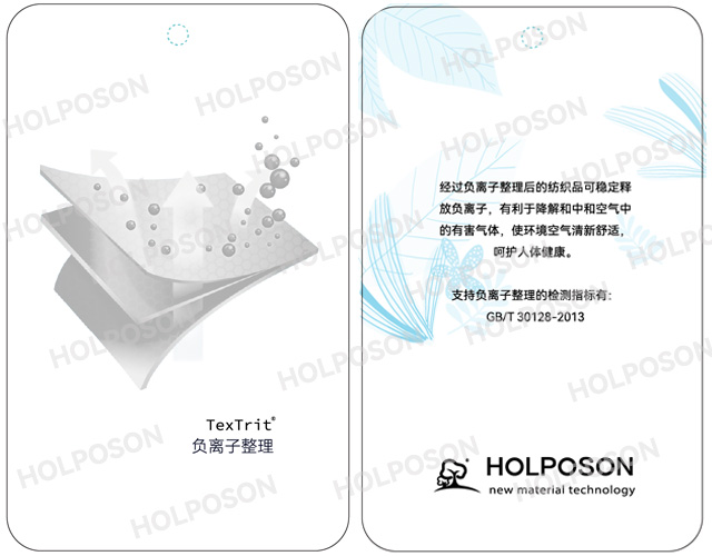 HOLPOSON® White Angel  适合用于各种纤维的后整理,整理品具有释放负离子功能,测试指标符合GB/T 20128-2013《纺织品 负离子发生量的检测和评价》标准。适用于中老年人群的:内衣、床品、墙布、地毯、桌布、围裙等。
