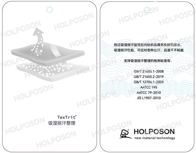 HOLPOSON® Aquabrother 适用于棉及其混纺织物的吸湿排汗功能整理剂,经本品处理后的织物,具有优良的手感,同时赋予纤维素纤维及其混纺织物具有好的亲水、吸湿排汗性能。HOLPOSON® Aquabrother赋予织物有一定的抗静电效果,能改善易去污效果。
