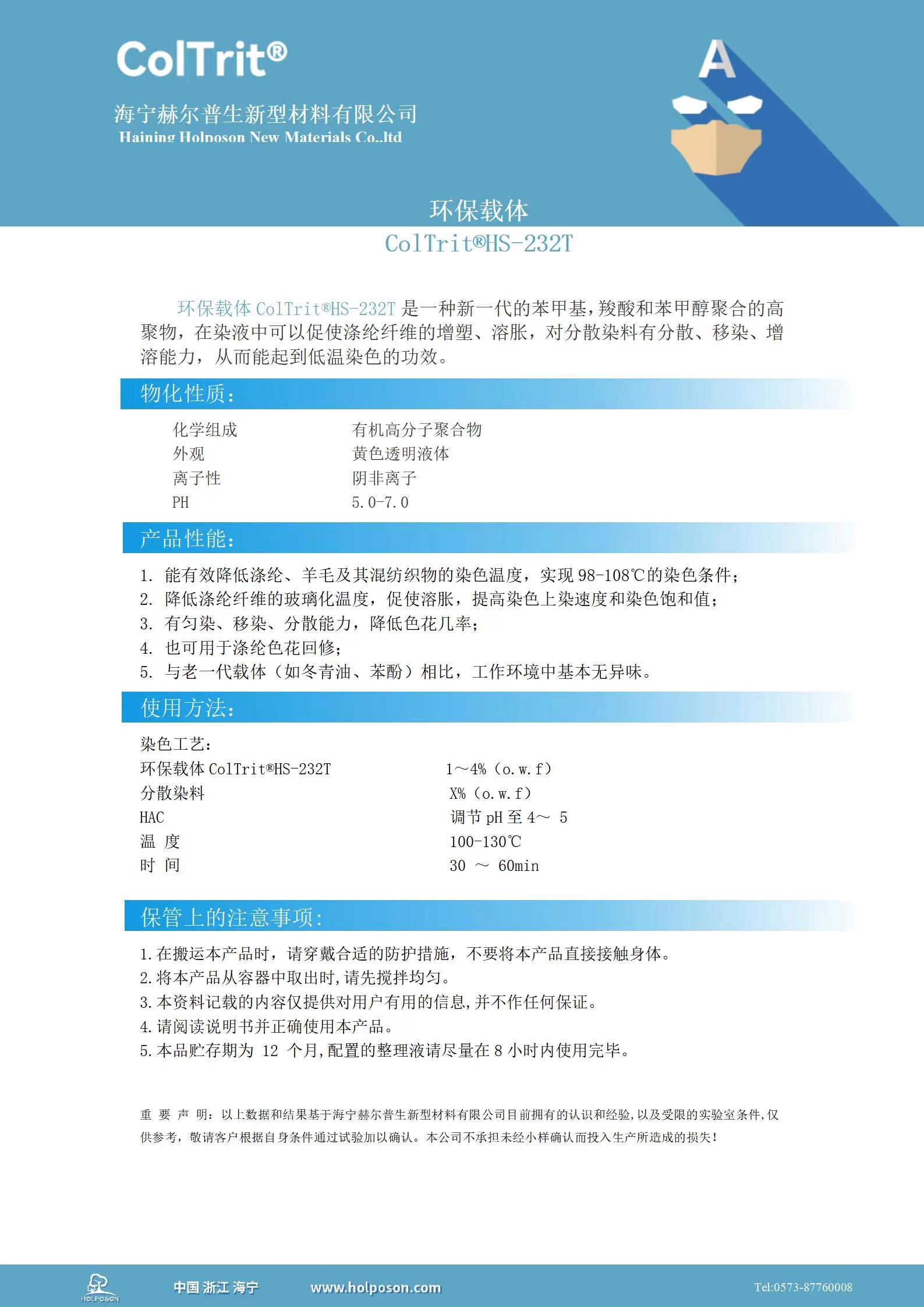 环保载体ColTrit®HS-232T是一种新一代的苯甲基,羧酸和苯甲醇聚合的高聚物,在染液中可以促使涤纶纤维的增塑、溶胀,对分散染料有良好的分散、移染、增溶能力,从而能起到低温染色的功效。