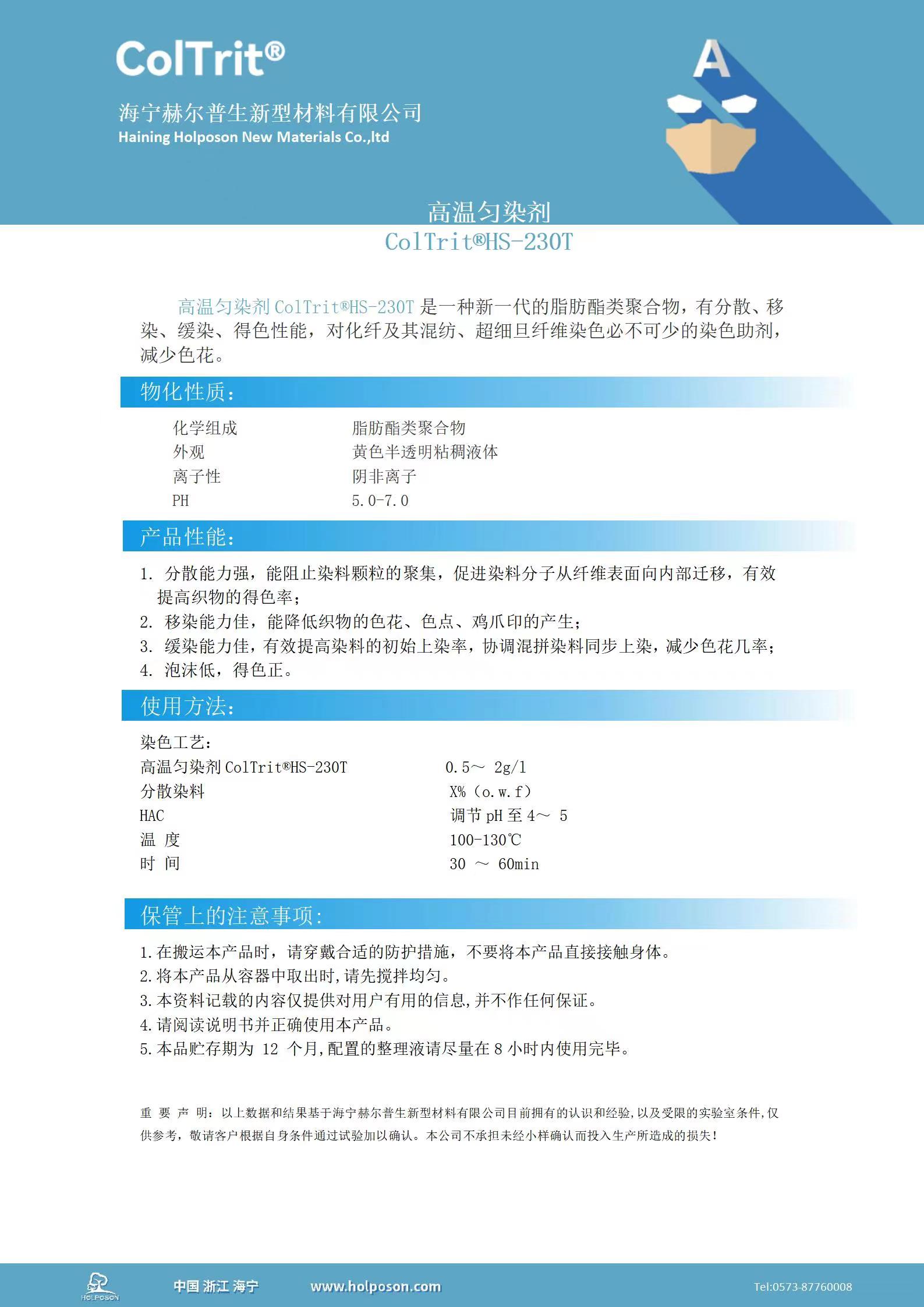 高温匀染剂ColTrit®HS-230T是一种新一代的脂肪酯类聚合物,有分散、移染、缓染、得色性能,对化纤及其混纺、超细旦纤维染色必不可少的染色助剂,减少色花。