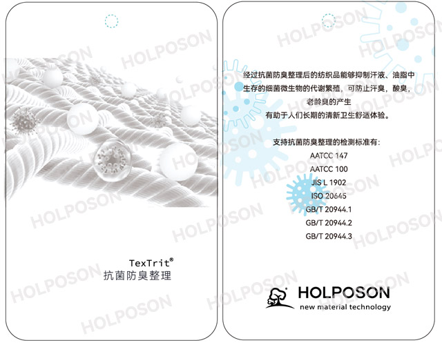 抗菌防臭整理剂HOLPOSON® CAPTAIN A-T是专注于纺织品抗菌防霉领域的防护功能材料,可以有效抑制大肠杆菌,白色念珠菌等细菌生长,符合美标AATCC100检测指标。适用纺织品有:涤纶,尼龙、腈纶,棉,粘胶及其混纺织物等。可应用在家纺、服装、袜子、窗帘、墙布、汽车内饰纺织、毛绒玩具等产品,赋予产品耐久的抗菌防护功能,使以上纺织品不容易因为滋生细菌而发霉变臭。